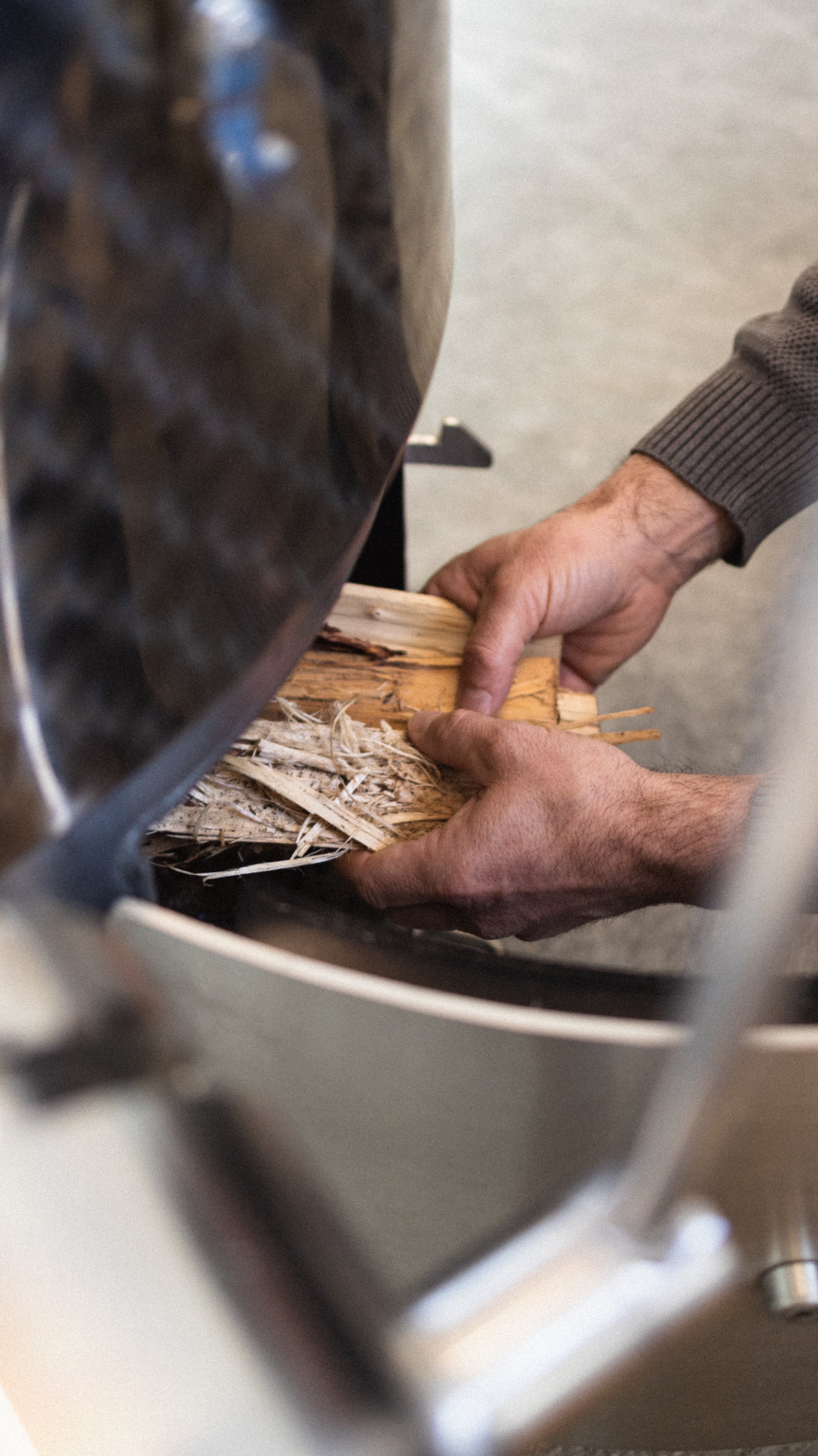 Wir destillieren auf ökologische Weise mit Holz aus unserem Wald.