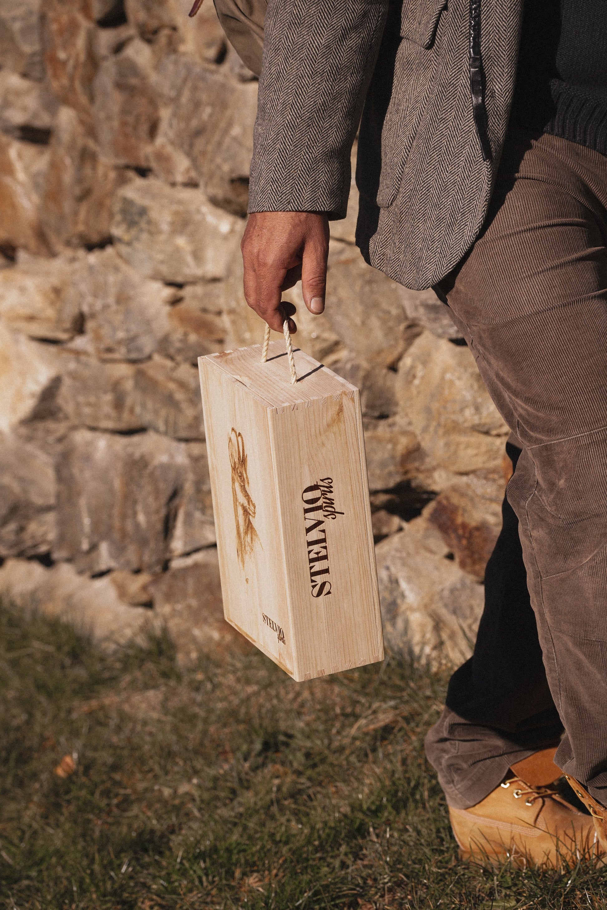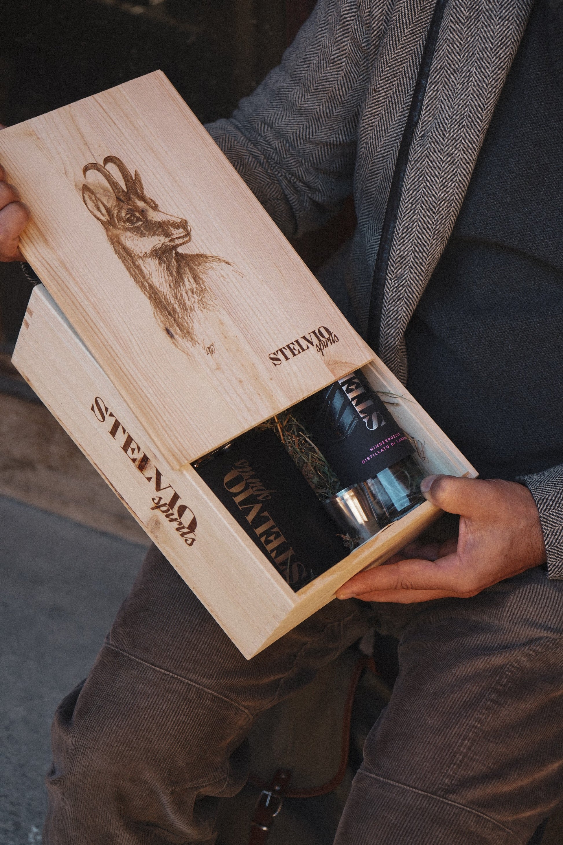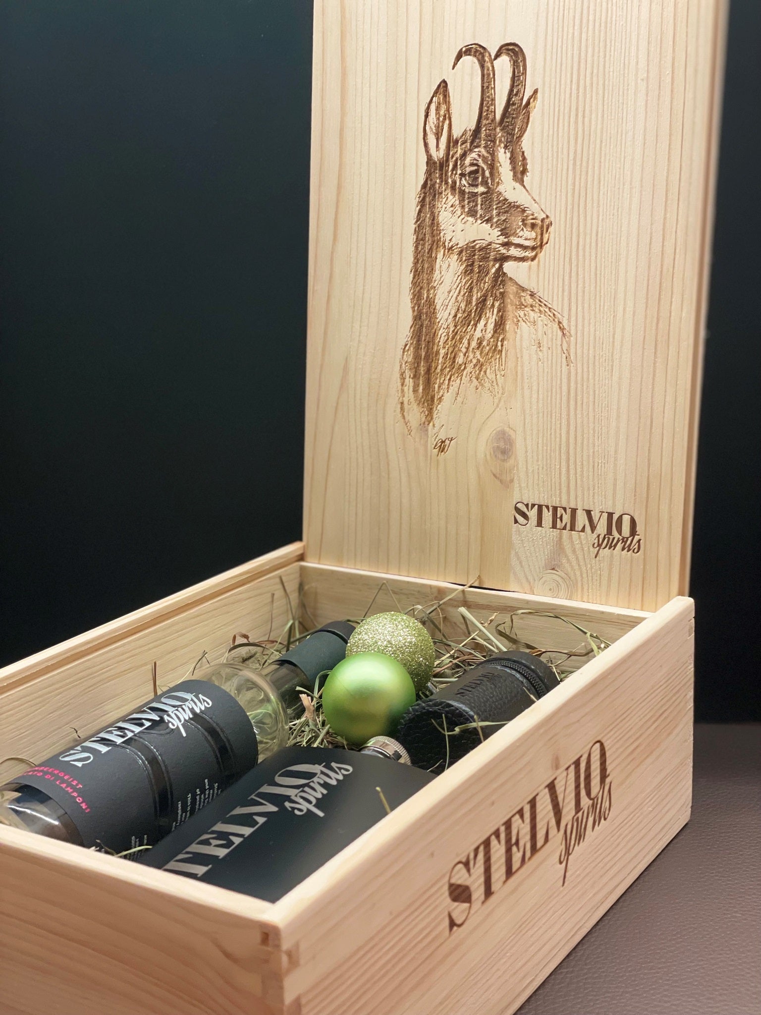 - Cassa di legno con logo Stelvio Spirits e incisione laser di un camoscio sul coperchio, realizzata dall'artista Tania Maria Wallnöfer (L x P x H = 310 x 210 x 105 mm)
